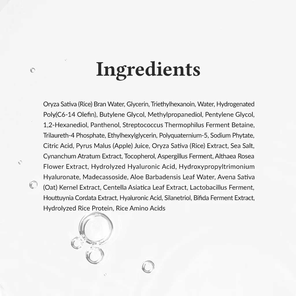 Oryza Sativa (Rice) Bran Water, 1,2-Hexanediol, Triethylhexanoin, Glycerin, Hydrogenated Poly(C6-14 Olefin), Tocopherol, Water, Butylene Glycol, Methylpropanediol, Pentylene Glycol, Streptococcus Thermophilus Ferment, Pyrus Malus (Apple) Juice, Panthenol, Hydrolyzed Hyaluronic Acid, Polyquaternium-51, Betaine, Trilaurate-4 Phosphate, Cynanchum Atratum Extract, Althaea Rosea Flower Extract, Oryza Sativa (Rice) Extract, Sea Salt, Aspergillus Ferment, Sodium Phytate, Citric Acid, Madecassoside, Hydroxypropyltrimonium Hyaluronate, Centella Asiatica Leaf Extract, Houttuynia Cordata Extract, Aloe Barbadensis Leaf Water, Bifida Ferment Extract, Hyaluronic Acid, Silanetriol, Avena Sativa (Oat) Kernel Extract, Lactobacillus Ferment, Hydrolyzed Rice Protein, Rice Amino Acids.