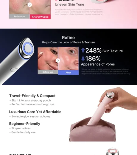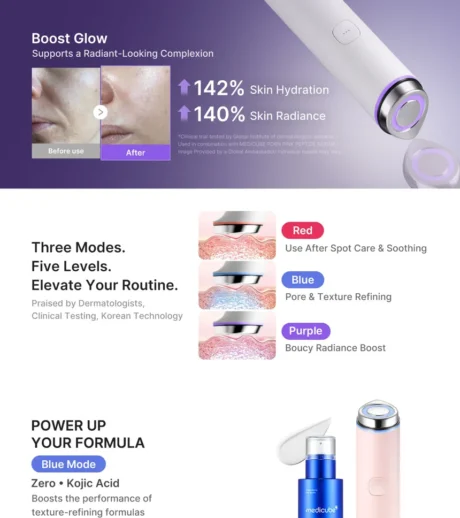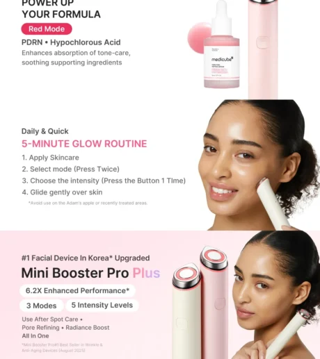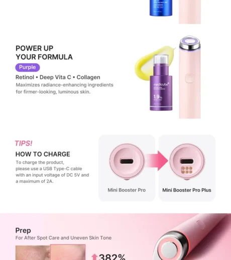 A medicube Age-R Booster Pro Mini Plus egy intelligens szépségápolási eszköz, amely fejlett mikroáramos és szónikus vibrációs technológiával fokozza a bőrápolás hatékonyságát . Úgy tervezték, hogy fokozza a bőrápoló összetevők felszívódását, segít revitalizálni a fakó bőrt, javítja a rugalmasságát, és feszesebb, ragyogóbb arcszínt eredményez. A továbbfejlesztett Mini Plus verzió elegáns kialakítású, nagy teljesítményű, és kompatibilis a Medicube arctisztító fejjel és a V-Rollerrel.