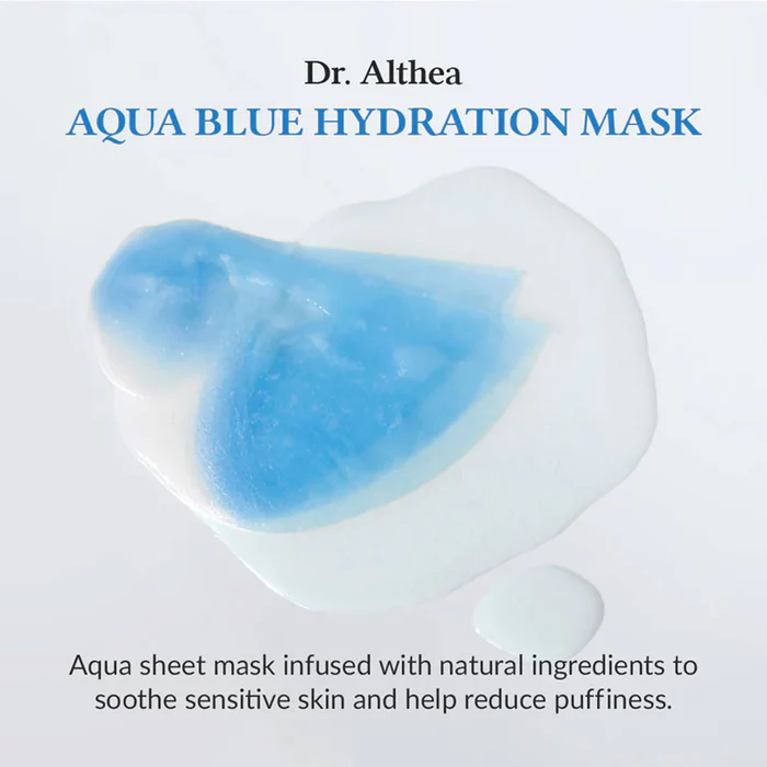 A Dr. Althea Aqua Blue Hydration Mask egy ultrahidratáló arcmaszk, amelyet mélyhidratálásra és az érzékeny bőr megnyugtatására terveztek. A tanninokban gazdag tölgyfa anyagból készült és bambuszvízzel átitatott arcmaszk mélyen hidratálja a bőrt és csökkenti a puffadást. E-vitaminnal és spirulina kivonattal gazdagítva javítja a bőr állapotát, míg a kék agávé levélkivonat fokozza a bőr rugalmasságát.