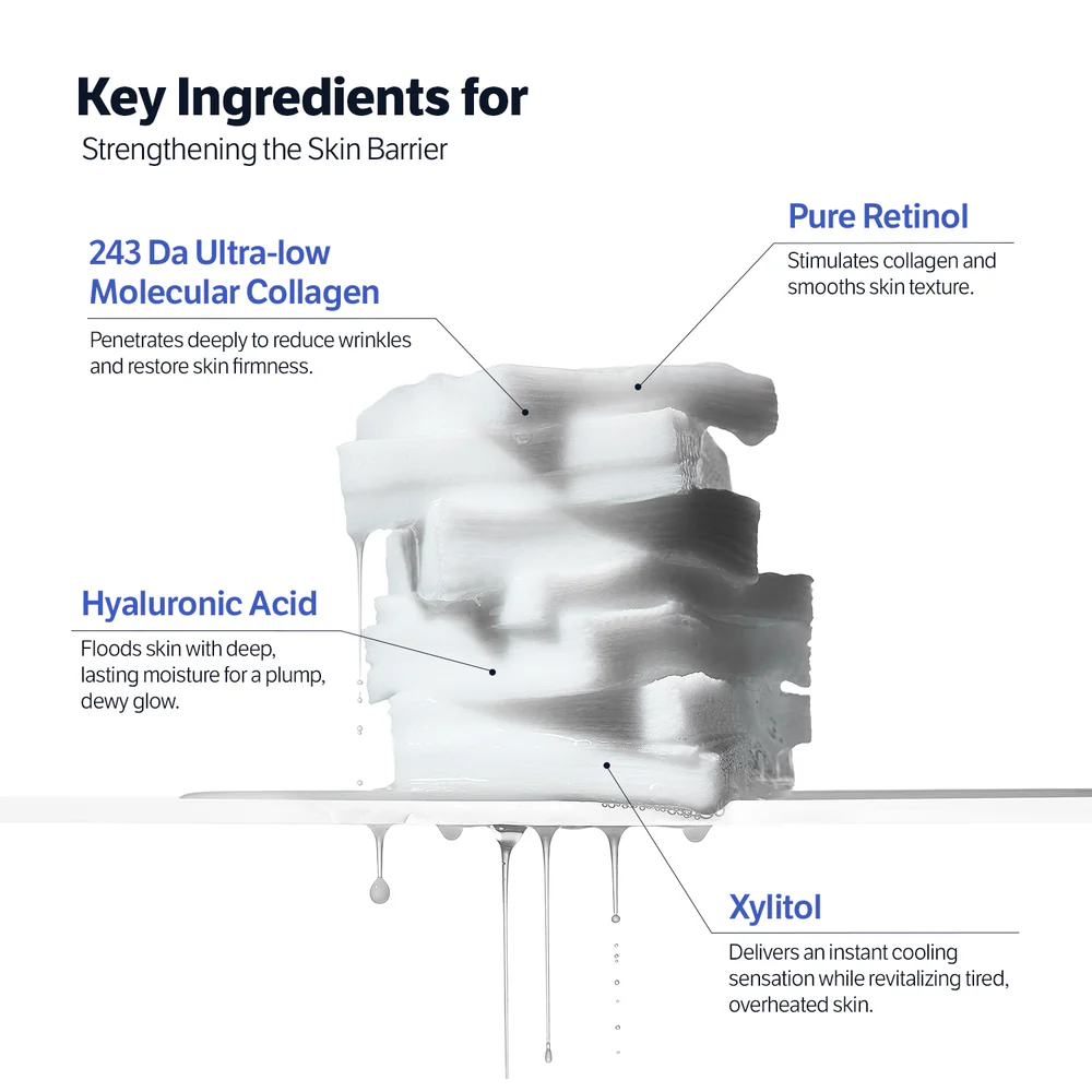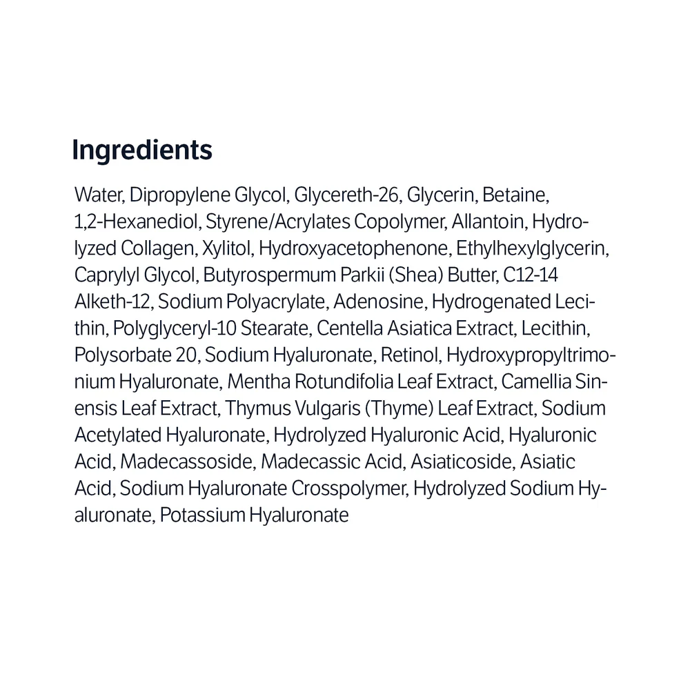 Water, Dipropylene Glycol, Glycereth-26, Glycerin, Betaine, 1,2-Hexanediol, Styrene/Acrylates Copolymer, Allantoin, Hydrolyzed Collagen, Xylitol, Hydroxyacetophenone, Ethylhexylglycerin, Caprylyl Glycol, Butyrospermum Parkii (Shea) Butter, C12-14 Alketh-12, Sodium Polyacrylate, Adenosine, Hydrogenated Lecithin, Polyglyceryl-10 Stearate, Centella Asiatica Extract, Lecithin, Polysorbate 20, Sodium Hyaluronate, Retinol, Hydroxypropyltrimonium Hyaluronate, Mentha Rotundifolia Leaf Extract, Camellia Sinensis Leaf Extract, Thymus Vulgaris (Thyme) Leaf Extract, Sodium Acetylated Hyaluronate, Hydrolyzed Hyaluronic Acid, Hyaluronic Acid, Madecassoside, Madecassic Acid, Asiaticoside, Asiatic Acid, Sodium Hyaluronate Crosspolymer, Hydrolyzed Sodium Hyaluronate, Potassium Hyaluronate
