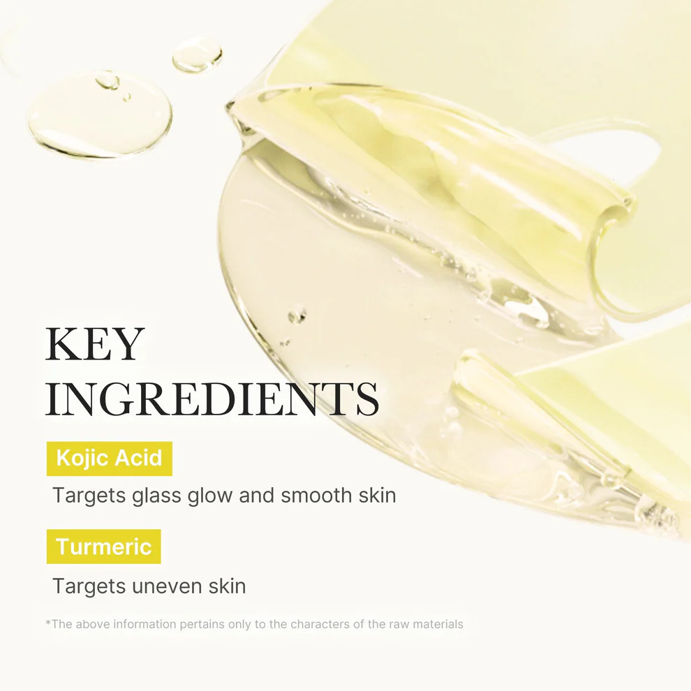 Fejlett összetétel: A kojisav, a kurkuma és a niacinamid együttesen fokozzák a bőr ragyogását és ragyogóbbá teszik az arcszínt, természetes ragyogást kölcsönözve a bőrnek.