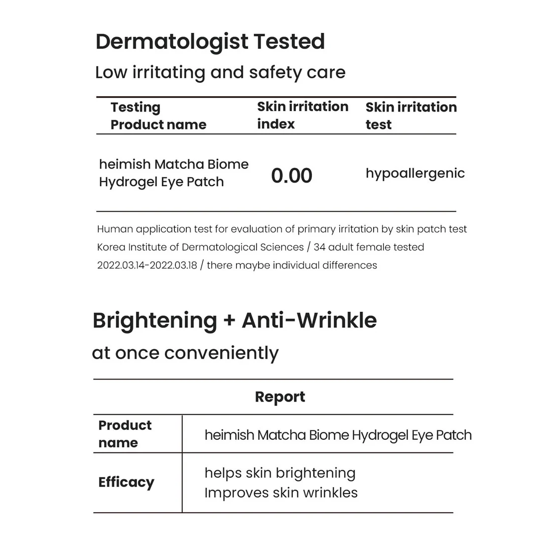 A speciális, zöld matcha tea probiotikum-komplexumon alapuló szemtapaszok hűsítő és frissítő hatásúak, segítenek enyhíteni a duzzanatokat és megszabadulni a szem alatti sötét karikáktól. Rugalmassá és feszessé teszik a bőrt. A szabadalmaztatott MATCHA BIOME komplex Jeju zöld tea kivonatot tartalmaz, mely nyugtató és regeneráló hatású, emellett hidratálja a bőrt.