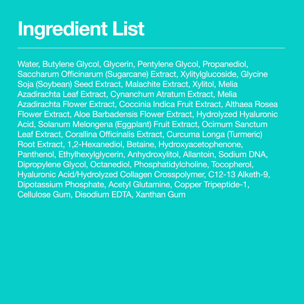 Water, Butylene Glycol, Glycerin, Pentylene Glycol, Propanediol, Saccharum Officinarum (Sugarcane) Extract, Xylitylglucoside, Glycine Soja (Soybean) Seed Extract, Malachite Extract, Xylitol, Melia Azadirachta Leaf Extract, Vincetoxicum Atratum Extract, Melia Azadirachta Flower Extract, Coccinia Indica Fruit Extract, Althaea Rosea Flower Extract, Aloe Barbadensis Flower Extract, Hydrolyzed Hyaluronic Acid, Solanum Melongena (Eggplant) Fruit Extract, Ocimum Sanctum Leaf Extract, Corallina Officinalis Extract, Curcuma Longa (Turmeric) Root Extract, 1,2-Hexanediol, Betaine, Hydroxyacetophenone,Panthenol, Ethylhexylglycerin, Anhydroxylitol, Allantoin, Sodium DNA, Dipropylene Glycol, Octanediol, Phosphatidylcholine, Tocopherol, Hyaluronic Acid/Hydrolyzed Collagen Crosspolymer, C12-13 Alketh-9, Dipotassium Phosphate, Acetyl Glutamine, Copper Tripeptide-1, Cellulose Gum, Disodium EDTA, Xanthan Gum