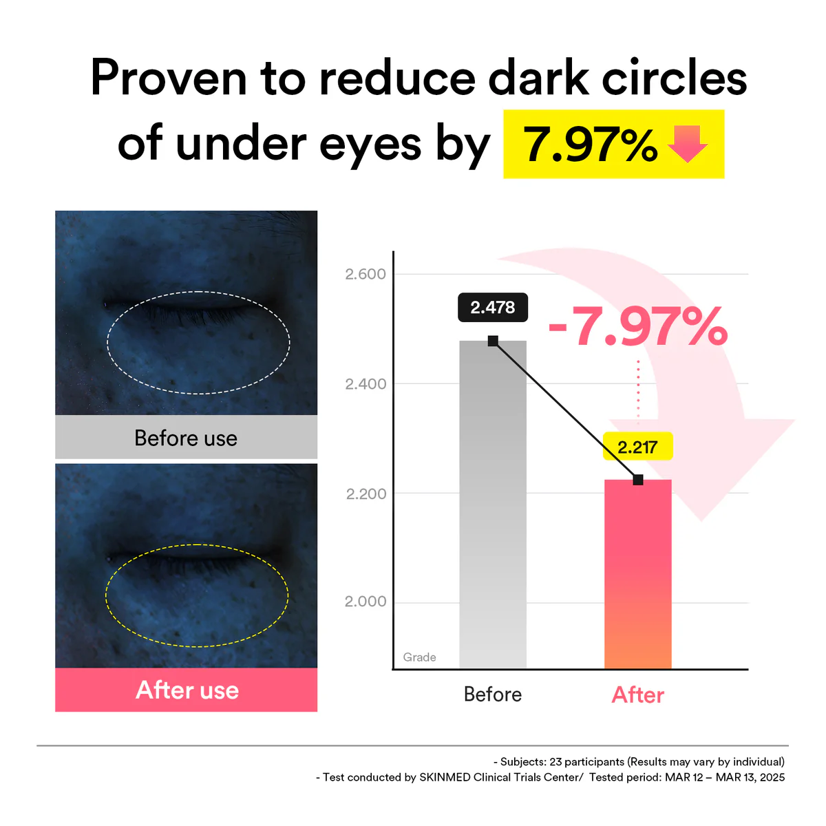 A retinal és PDRN kombinációja segíti a bőr megújulását, miközben a koffein és niacinamid csökkenti a puffadást és halványítja a sötét karikákat.