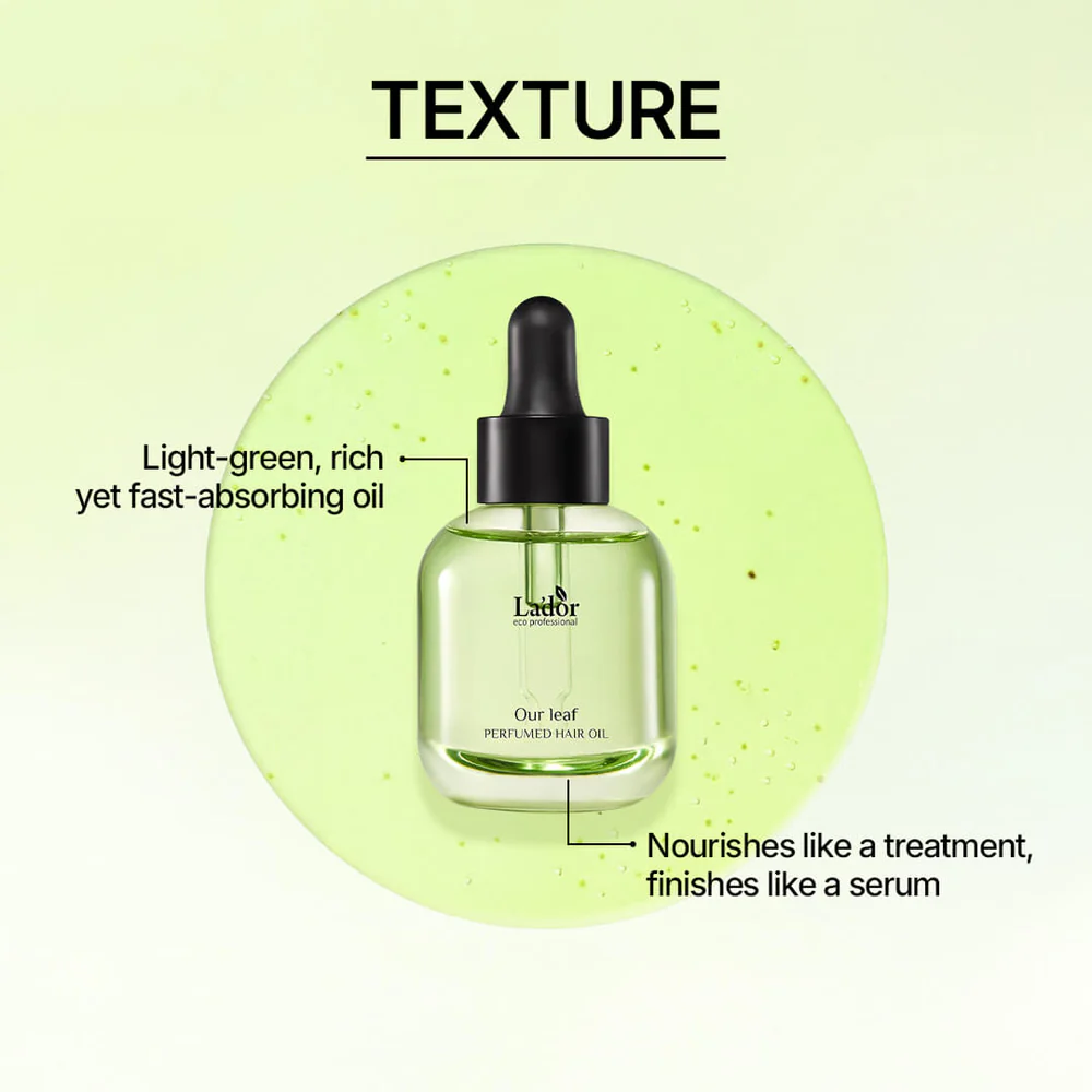 A LADOR Perfumed Hair Oil Our Leaf több, mint egy hajolaj – ez a mindennapi szépségápolási készítmény selymes fényt, mély táplálást és ellenállhatatlan, friss illatot biztosít. Könnyű, nem zsíros formulája gyorsan felszívódik, intenzív hidratálást biztosít, miközben még a legmakacsabb göndörödést és szálló hajszálakat is megszelídíti. Akár száraz, sérült vagy egyenes a hajad, ez az olaj puhává, simává és könnyedén tapinthatóvá teszi.