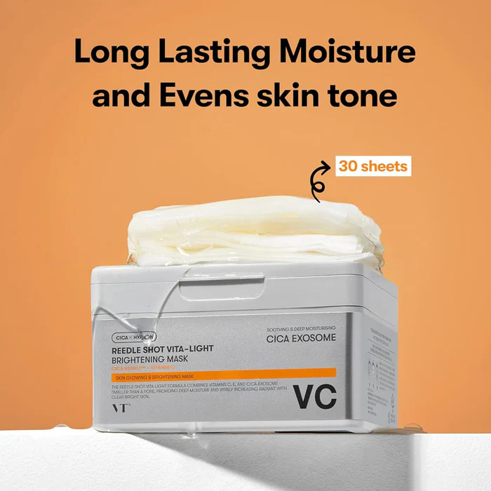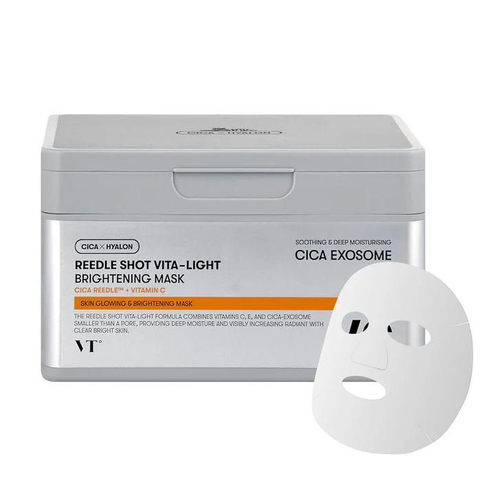 A VT Cosmetics Reedle Shot Vita-Light Brightening Mask egy multivitamin sheet maszk, amely kifejezetten a fakó, egyenetlen tónusú bőr ragyogóbbá tételére készült. A formula Cica Reedle™ technológiát használ, amely mikroszkopikus, bőrbarát struktúrával segíti a hatóanyagok mélyebb és hatékonyabb felszívódását. Minden egyes maszkot vitaminok és antioxidánsok gazdag eszenciája itat át, így minden használat erős hidratálást és fénnyel telített ragyogást biztosít.